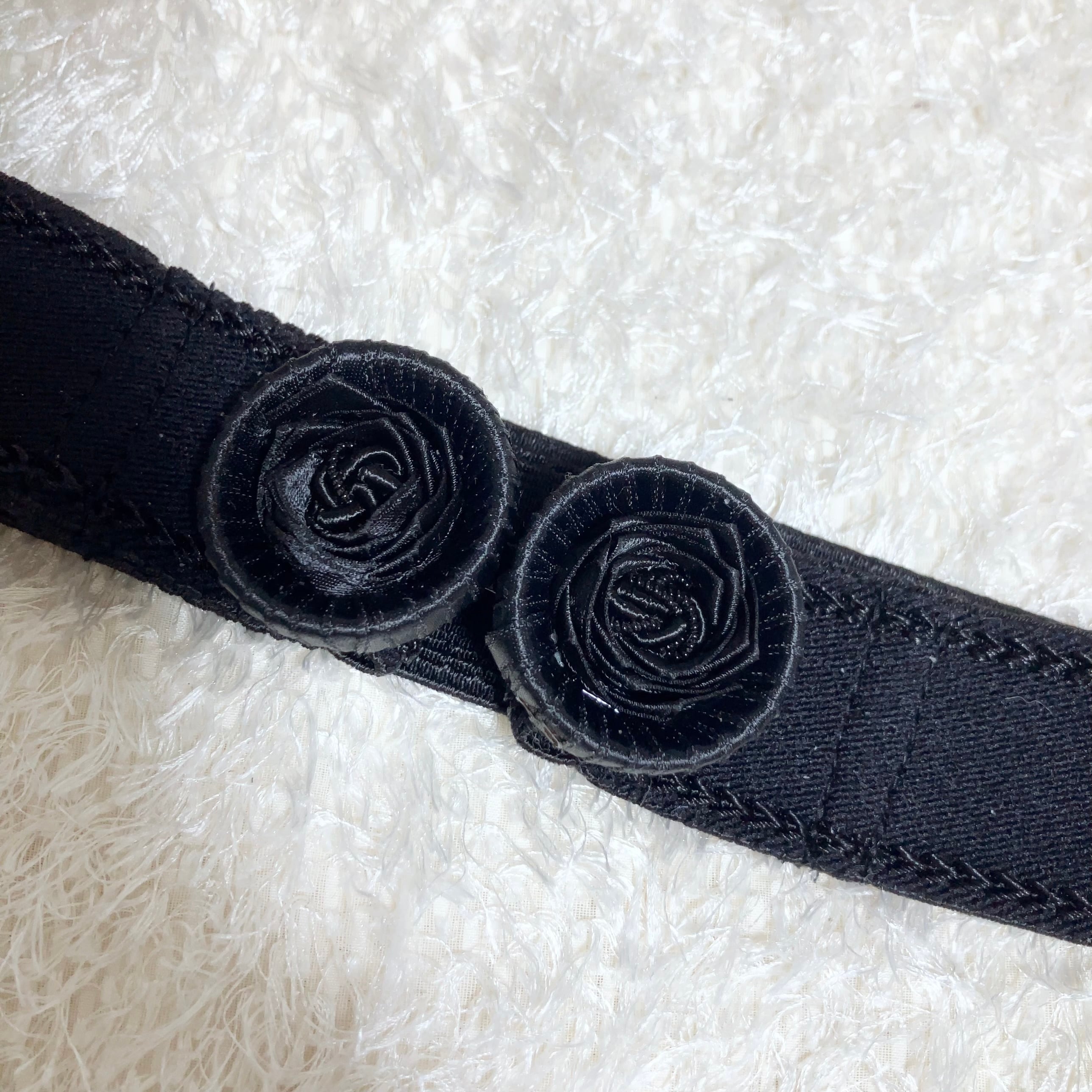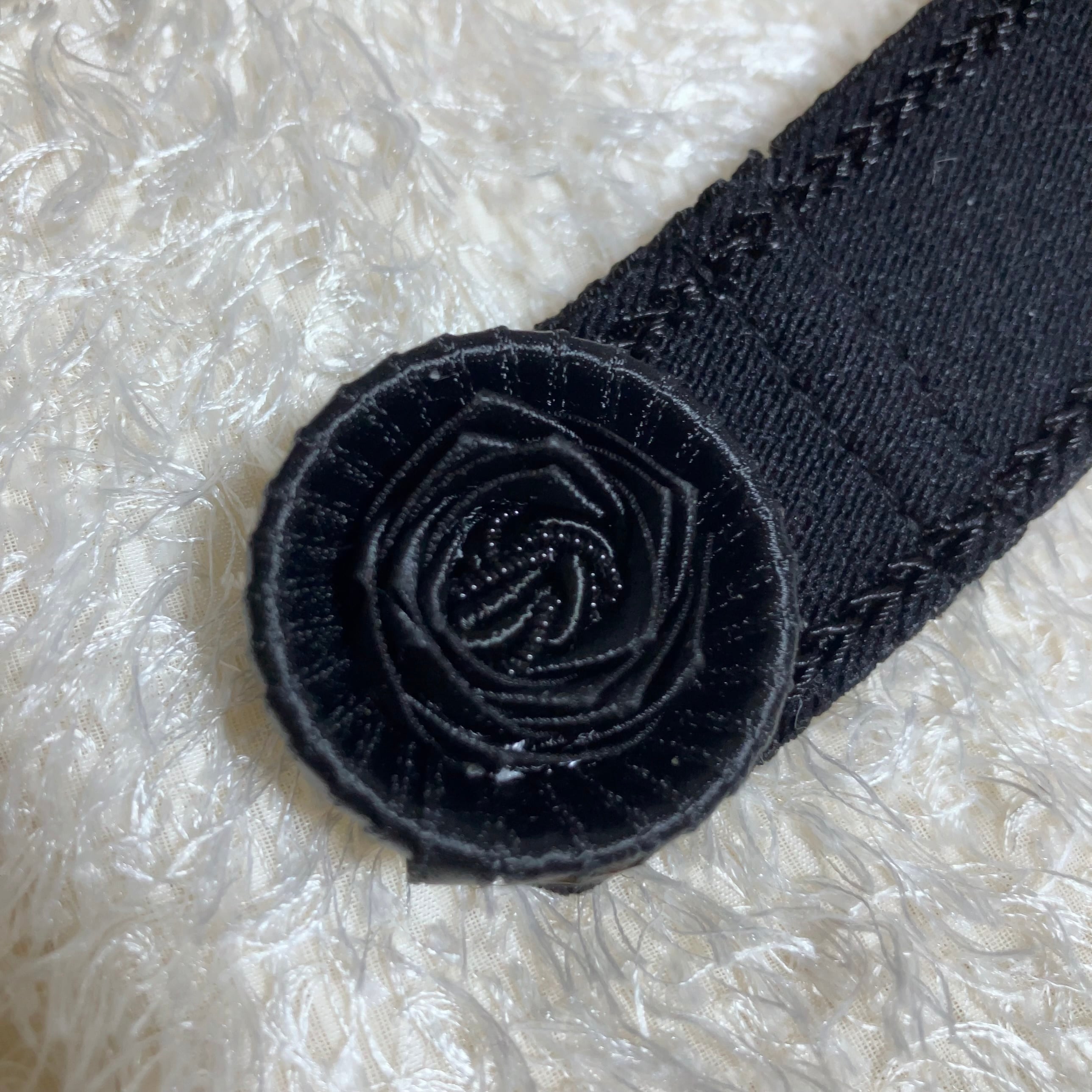 サテンリボンとビーズの巻薔薇のバックルを使用したゴムベルトです。